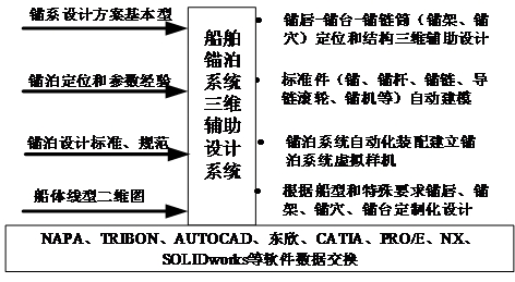 錨系三維設計軟件系統(tǒng)具有自主知識產(chǎn)權(著作權證書,軟著登字0627336),面向錨系設計的廣大用戶而開發(fā),為船舶設計院、船廠等用戶設計錨泊系統(tǒng)提供專用設計軟件。軟件就錨系設計提供錨系參數(shù)化輔助建模、錨系輔件參數(shù)化建模、錨標準件數(shù)據(jù)庫以及錨泊系統(tǒng)自動裝配四大模塊。本軟件可為我們開發(fā)的另一款拉錨試驗仿真軟件提供錨系設計三維模型(虛擬樣機),同時也可輸出后期用于船舶建造過程使用的生產(chǎn)設計圖紙(錨唇錨臺安裝坐標圖、錨唇鑄件剖面和型值點、錨臺展開圖、樣板圖、襯板剖面圖、錨鏈筒展開圖、錨穴開口位置圖等)。設計圖紙和模型可以與船舶行業(yè)通用設計軟件(TRIBON、NAPA、CATIA、PRO/E、NX、AUTOCAD、solid works、滬東東欣 軟件等)進行數(shù)據(jù)交換、輸入和輸出。